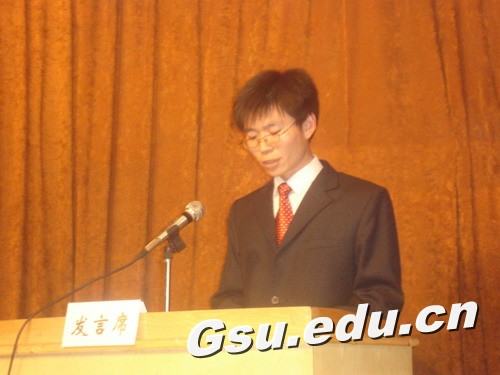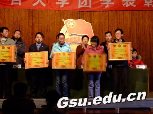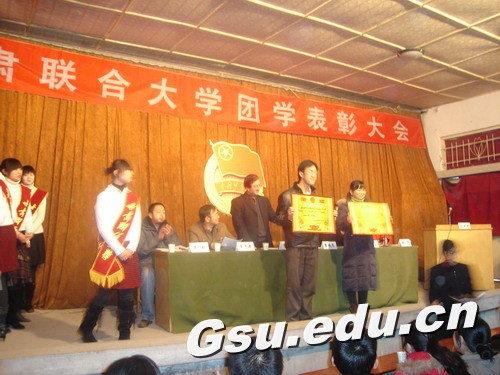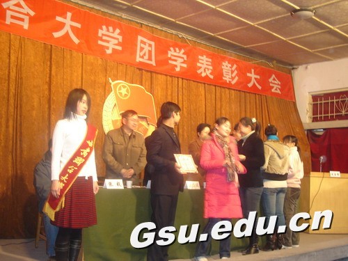 在庄严的国歌声中,表彰大会拉开了序幕。张毅老师宣读了甘肃联合大学2005-2006学年度“先进团组织”、“优秀共青团干部”、“优秀共青团员”;暑期社会实践“先进个人”、“优秀调查报告作者”、“优秀指导教师”“优秀学生社团”“优秀社团骨干”“优秀社员”及省级“社会实践优秀队员”“先进个人”“优秀指导教师”的表彰决定。接着,在欢快的乐曲中,校领导为所有的获奖集体和个人颁发了荣誉证书及奖牌。随后,“优团优干,优秀团组织”获奖代表魏华;“社会实践先进个人”、“优秀调查报告作者”获奖代表宋乐;“优秀学生社团”、“优秀社团骨干”、“优秀社员”获奖者代表李子乾同学进行了发言,他们共同表示:在今后的团学工作中 ,一要起到模范表率作用,同时也向长期关心和帮助他们的学校领导、老师、同学表示谢意。最后也动员全校学生认真学习,积极参与威尼斯的迎评促建工作,为学校的明天贡献一份微薄之力。