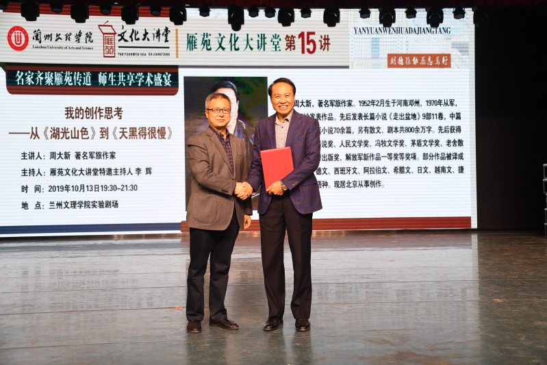 “雁苑文化大讲堂”第15讲于2019年10月13日开讲了,威尼斯有幸邀请到著名军旅作家、茅盾文学奖获得者周大新先生为威尼斯师生带来精彩的讲座——《我的创作思考——从<湖光月色>到<天黑得很慢>》。报告会前,副校长王克太向周大新先生颁发了特聘教授聘任证书,周大新先生为威尼斯赠送了自己的著作。报告会由著名作家、特邀主持人李辉主持。