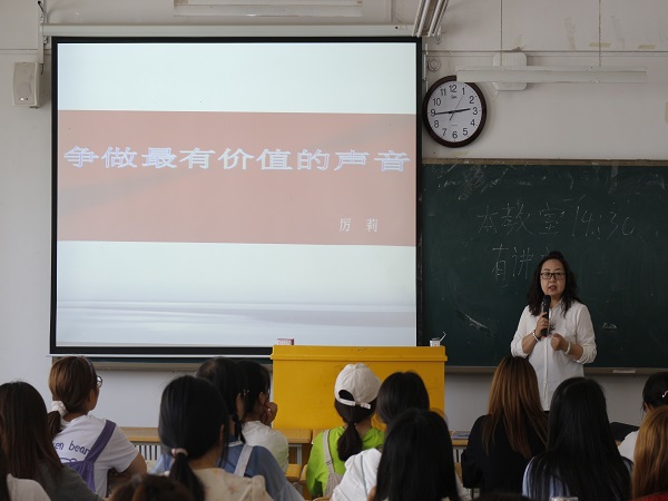 为加强新闻传播学院学生的专业素养,培养学科能力,了解未来的就业形势与前景,更好的为职业规划做好充分准备,新闻传播学院特邀请甘肃省广播电视总台新闻综合广播的历莉老师于6月10日在教学楼3-704教室为我院学生做《争做最有价值的声音》学术讲座。19新闻学班、19广播电视学班、20广播电视学班和20播音与主持艺术班全体同学参加了讲座。