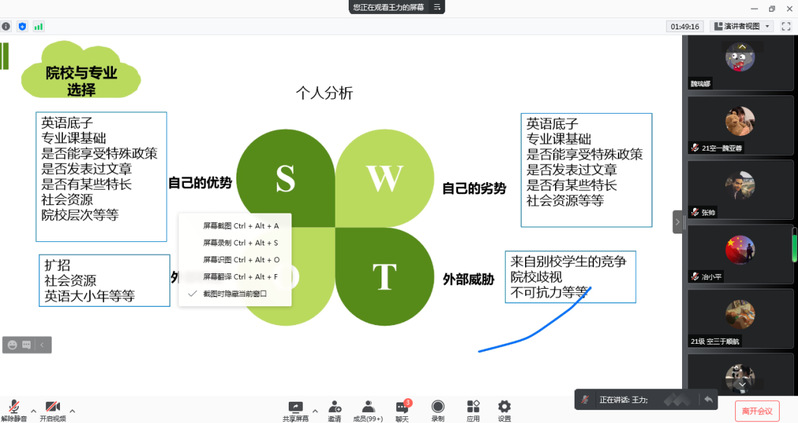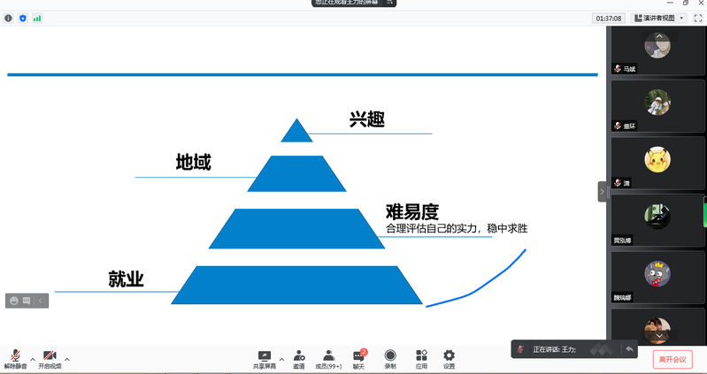 王力博士针对“为何考研、报考程序、招生类型、信息获取、如何选择、如何准备、经验总结”共7个方面与学生进行了交流。重点分享了公共课和专业课如何备考,初试、复试、调剂如何联系导师,普及了专业硕士和学历硕士的区别,告诫同学们在面对不同专业、不同学校时如何选择等问题。