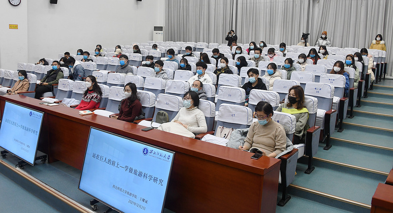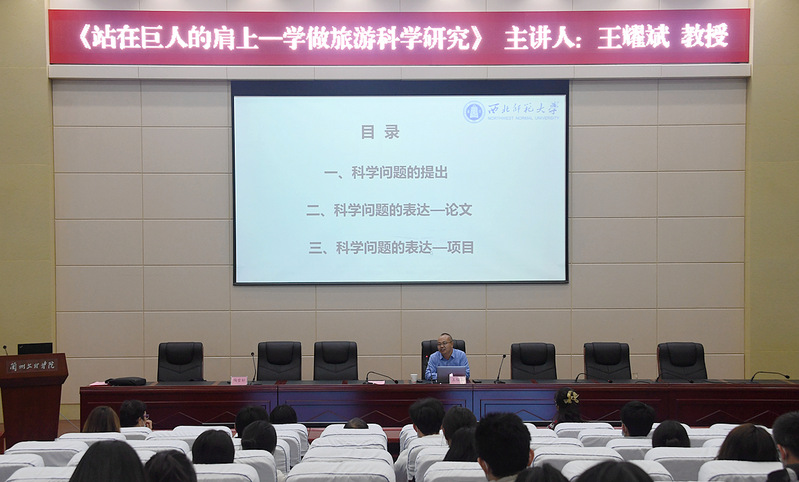 为进一步提升教师教学科研水平,强化学生科研意识,提高学生专业素养,12月2日下午,旅游学院邀请西北师范大学研究生院副院长王耀斌教授在学术报告厅做题为“站在巨人的肩膀上——学做旅游科学研究”的学术讲座。结合当前疫情防控工作需要,本次讲座采取“线上+线下”的方式同步进行,旅游学院全体教师、旅游管理及酒店管理、航空服务艺术与管理专业本科生共300余人参加,讲座由旅游学院陶雪松正高级工程师主持。