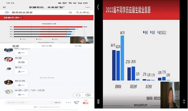 吴老师通过2022届不同学历应届生就业意愿柱状图的分析,引导大家清晰明了的不同学历就业的方式;以企业为什么喜欢高学历人才和要不要升学两个问题向大家解释了不同的学历对就业方式的不同,以视频的形式让大家更加清楚就业的方向,以图形的形式探索职业信息,并提出实习面试常见问题与应对方式。