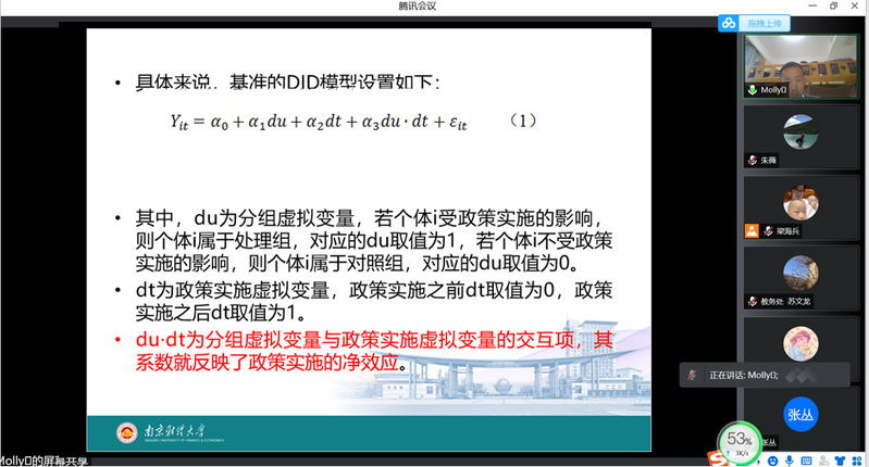 为进一步提升学院教师科研能力,为科研人员提供有效的科研指导服务。5月23日,南京财经大学钱龙副教授应邀为经济管理学院教师开展题为“政策分析的利器:不得不说的DID模型”的线上讲座。讲座由经济管理学院副院长梁海兵主持,学院全体教师参加。