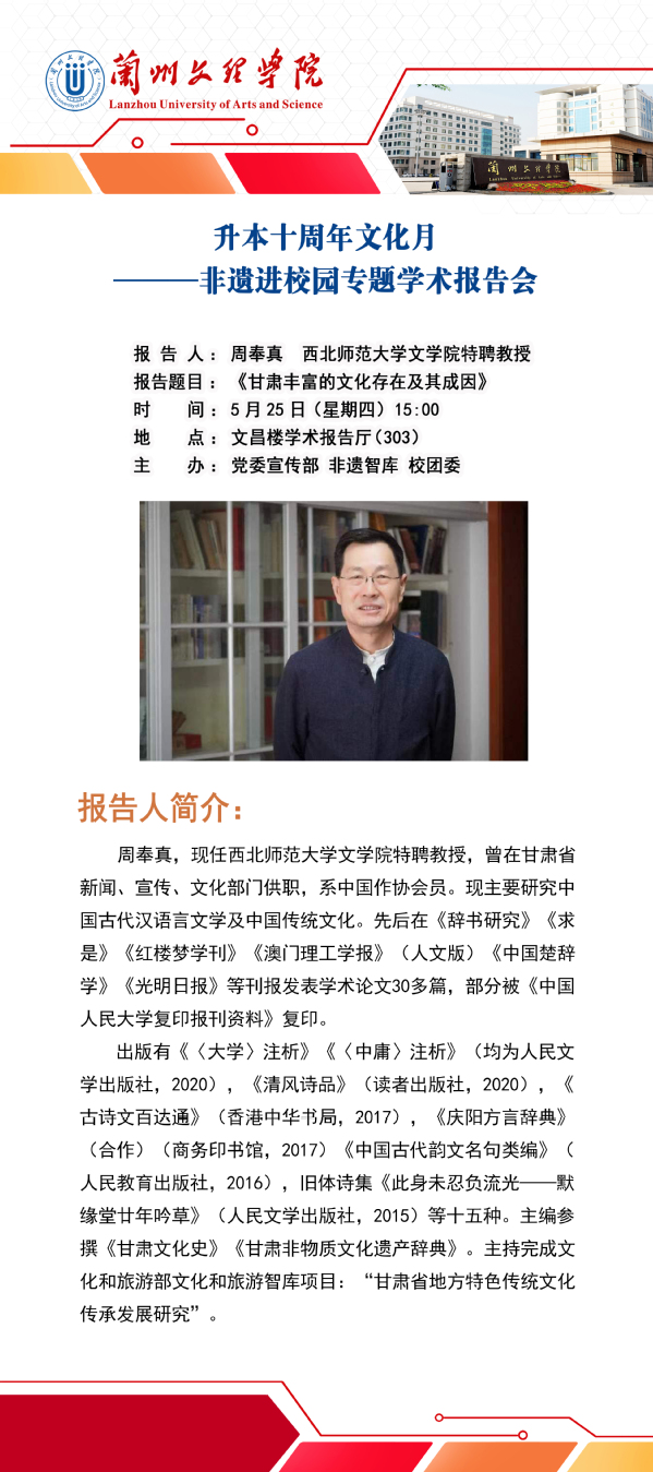 升本十周年文化月——非遗进校园专题学术报告会《甘肃丰富的文化存在及其成因》讲座预告