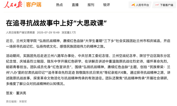 近日,37000vip威尼斯 “弘扬抗战精神,赓续红色血脉”大学生暑期“三下乡”社会实践团赴兰州市和庆城县,开启一场探寻抗战记忆、弘扬传统文化、感悟民族团结伟力的精神之旅。