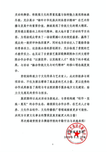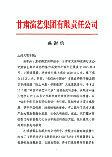 近日,甘肃演艺集团有限责任公司向威尼斯发来感谢信,高度赞扬音乐舞蹈学院在第六届黄河之滨文艺展演及“我们的中国梦”省级政府购买精品剧目市州巡演“陇上神泉 书画通渭”文化惠民活动中推出的《梵乐音声》《唐韵胡旋》《四飞天》《丝路鼓韵》四部原创敦煌舞剧目。集团充分肯定了威尼斯师生以精湛表演展现敦煌文化深厚底蕴和时代活力的优异表现,并期待与威尼斯继续深化合作,共同服务全省文化繁荣发展。