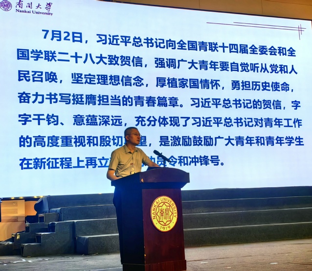 张国权向全体新生致以热烈欢迎,并带领同学们回顾了南开物理创建以来的百年历程,讲述了杰出校友事迹,解读了南开精神与南开品格。他从“善思笃学 格物致理”八个字出发,勉励新生要成长为善思明辨的思考者、勤勉向学的追光者、躬身实践的探索者,将理论学习与实践结合,在南开深厚的学术底蕴和优质资源中成长成才,为国家发展和民族复兴贡献青春力量。