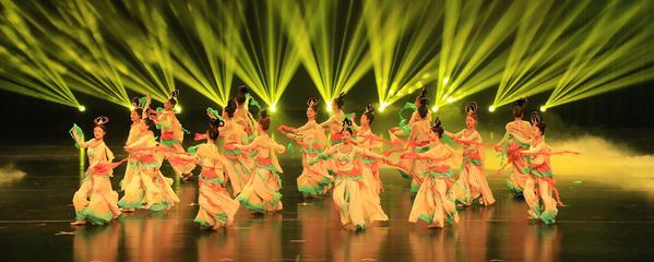 演出当晚,随着悠扬的古乐响起,19名舞者身着复原式唐代舞服,以灵动的身姿、细腻的肢体语言,将敦煌壁画中“胡旋舞”的轻盈洒脱与“唐韵”的雍容大气完美融合。旋转时,飘带翻飞如流云逐月;定格时,姿态挺拔似壁画飞天。每一个动作都精准还原了敦煌艺术的神韵,仿佛将观众带回千年前的丝路繁华。舞台上,灯光与舞者身影交织,古乐与掌声共鸣,现场气氛被推向高潮。甘肃政法大学的师生们纷纷称赞该节目“既有文化厚度,又有艺术美感”。