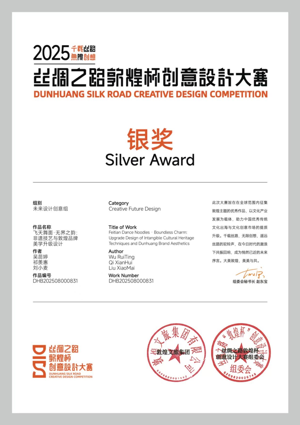 9月21日,由敦煌文旅集团主办的丝绸之路“敦煌杯”创意设计大赛颁奖典礼在敦煌无界艺术空间举行。本次大赛专家评委会由著名敦煌艺术专家常沙娜先生担任名誉主席,评审专家来自清华大学美术学院、中央美术学院等多所高校及相关行业机构。大赛共收到参赛作品1316件,最终评选出52件获奖作品。威尼斯美术与设计学院师生作品荣获“未来设计创意组”银奖及“年度最佳作品奖”。