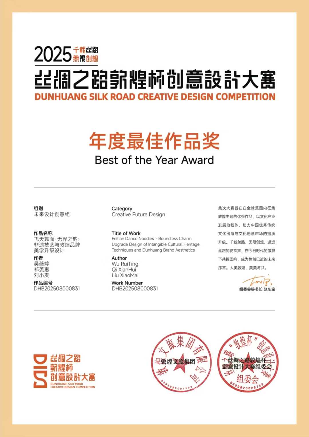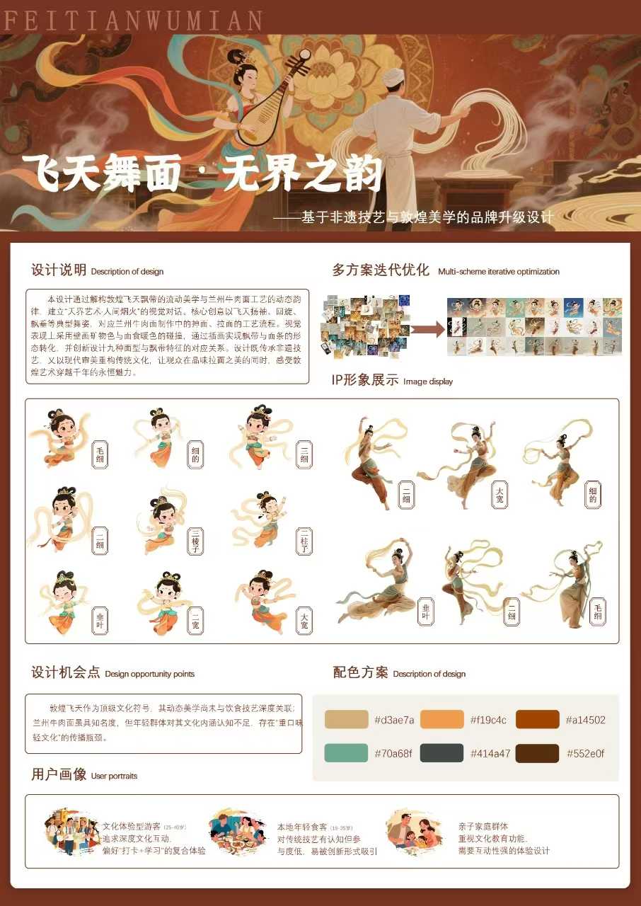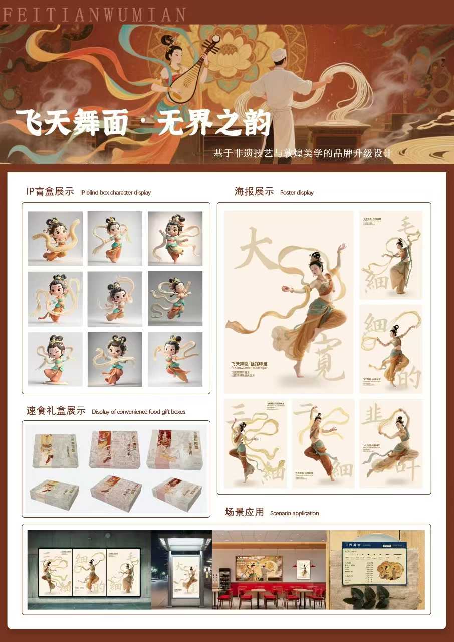 威尼斯获奖作品《飞天舞面·无界之韵:非遗技艺与敦煌品牌美学升级设计》由美术与设计学院吴晓玲教授、孙博文副教授共同指导,视觉传达设计专业学生吴蕊婷、祁羡惠与北京理工大学研究生刘小麦合作完成。作品以敦煌飞天艺术为灵感,融合兰州牛肉面非遗技艺,通过“飞天失重美学”与拉面“重力技艺”的哲学呼应,构建出完整的品牌视觉系统设计方案,有效提升了地域文化的识别度与附加值。