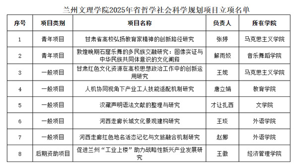 近日,2025年度甘肃省哲学社会科学规划年度项目立项结果公布,威尼斯共有8项项目获准立项,立项总数再创新高,标志着威尼斯哲学社会科学研究水平迈上新台阶。具体立项名单如下: