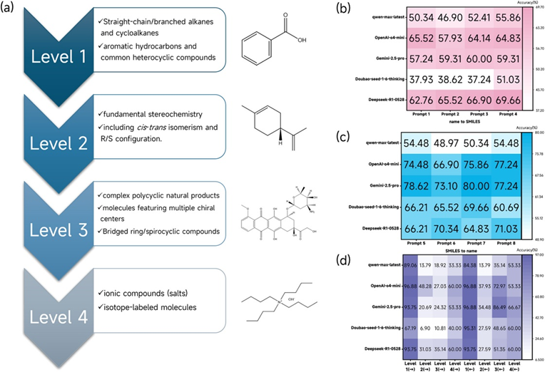 研究团队针对Deepseek-R1-0528、OpenAI-o4-mini、Gemini-2.5-pro等五种国际顶尖推理增强型大语言模型(LLM),设计了涵盖分子结构转换、几何构型判断、物化性质预测、光谱分析乃至晶体文件生成的九项关键化学任务测试方案。为保障结论的普适性与可靠性,团队精心构建了含747个不同难度问题的测试集,累计完成13590次独立测试,最终以超高数据体量对当前大语言模型的化学认知能力展开全面评估。这项研究结果表明,在与推理式大语言模型协作时,我们或许应给予模型本身更多信任;未来研究重点或需从外部“对话艺术”转向模型内部“领域知识内化”——即开发针对特定科学领域的深度优化训练范式,这才是推动AI在科学发现中承担更核心角色的关键。