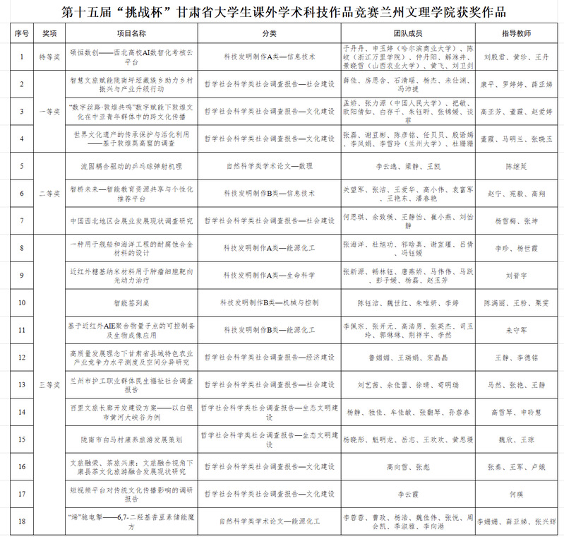 近日,共青团甘肃省委等七部门联合通报表扬第十五届“挑战杯”甘肃省大学生课外学术科技作品竞赛获奖作品。威尼斯学生在哲学社会科学类、自然科学类、科技发明制作类竞赛中获得特等奖 1 项、一等奖 3 项、二等奖 6 项、三等奖 10 项。