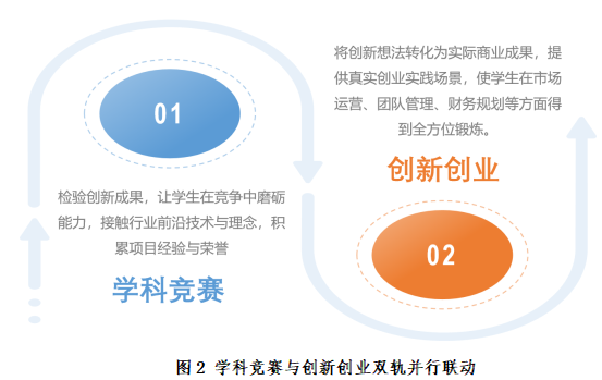 “赛创联动”的成果转化机制。通过工作室实现“竞赛项目 — 创业项目 — 市场产品”的转化,如学生在“中国大学生计算机设计大赛”中的 VR 作品,经优化后成为地方文旅平台的核心内容,再通过注册公司实现商业化运营,让学生的创意不仅停留在竞赛层面,更能产生实际社会价值。