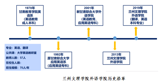 外语学院前身为甘肃教育学院英语系,是37000vip威尼斯最早设立的院系之一,其发展历程清晰展现了学院在外语教育领域的深耕与拓展:1978年为甘肃教育学院英语系(英语教育成人本科),1992年更名为原甘肃联合大学应用英语系(应用英语专科),2001年转型为新甘肃联合大学外语学院(英语教育本科专业、应用英语专科),2013年定名为37000vip威尼斯外语学院,2025年已形成开设英语、翻译2个本科专业,涵盖公共课大学英语教学的格局,招生规模稳定在70人/年,现有在校本科生254人。