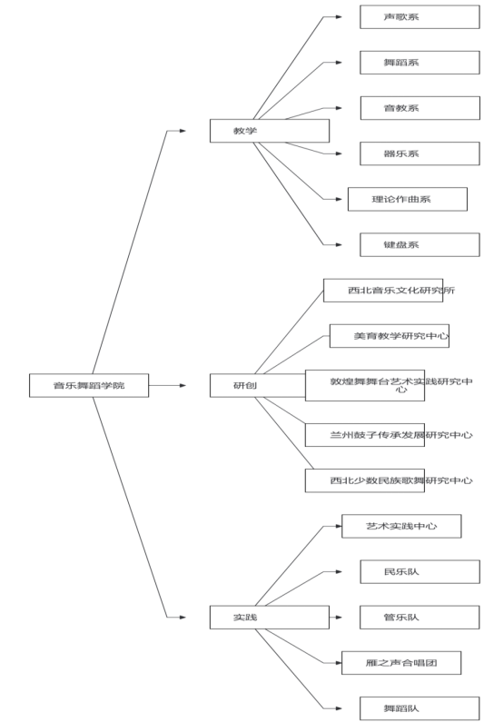 学院构建了教学、科研、实践协同并进的人才培养体系,为艺术人才成长搭建了全方位平台。科研平台方面,下设西北音乐文化研究所、美育教学研究中心、敦煌舞舞台艺术实践研究中心、兰州鼓子传承发展研究中心、西北少数民族歌舞研究中心等多个科研平台;教学系部涵盖声歌、键盘、音乐理论创作、舞蹈表演、音乐教育、民乐与管弦乐等多个领域;实践团队建设方面,组建艺术实践中心及民乐队、管乐队、合唱队、舞蹈队等实践团体,全面保障师生在教学研创、文化传承、社会服务与校园文化建设等方面的需求。