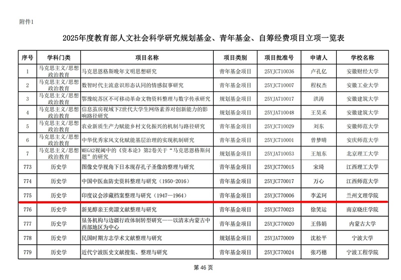 近日,教育部社会科学司正式公布2025年度教育部人文社会科学研究项目立项结果(教社科司函〔2025〕16号),威尼斯文学院李孟珂博士申报的《印度议会涉藏档案整理与研究(1947-1964)》获批立项。